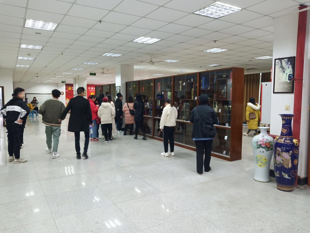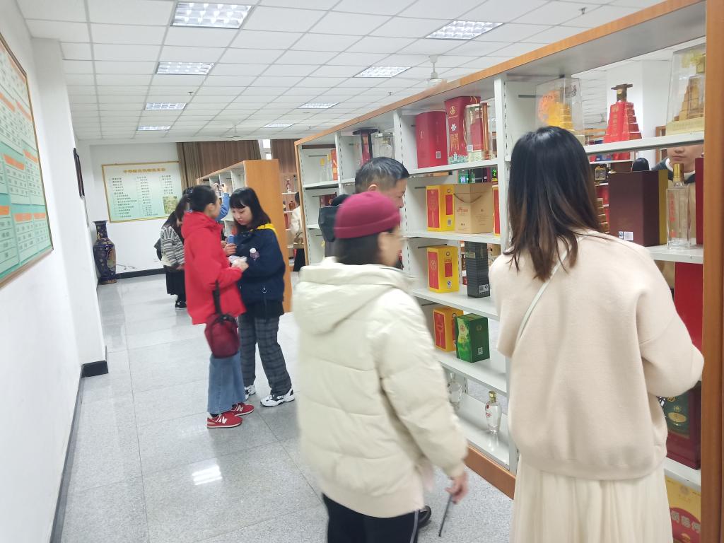 图为美艺学院卢忠老师带领同学们参观宜宾地方酒包装博物馆的情形