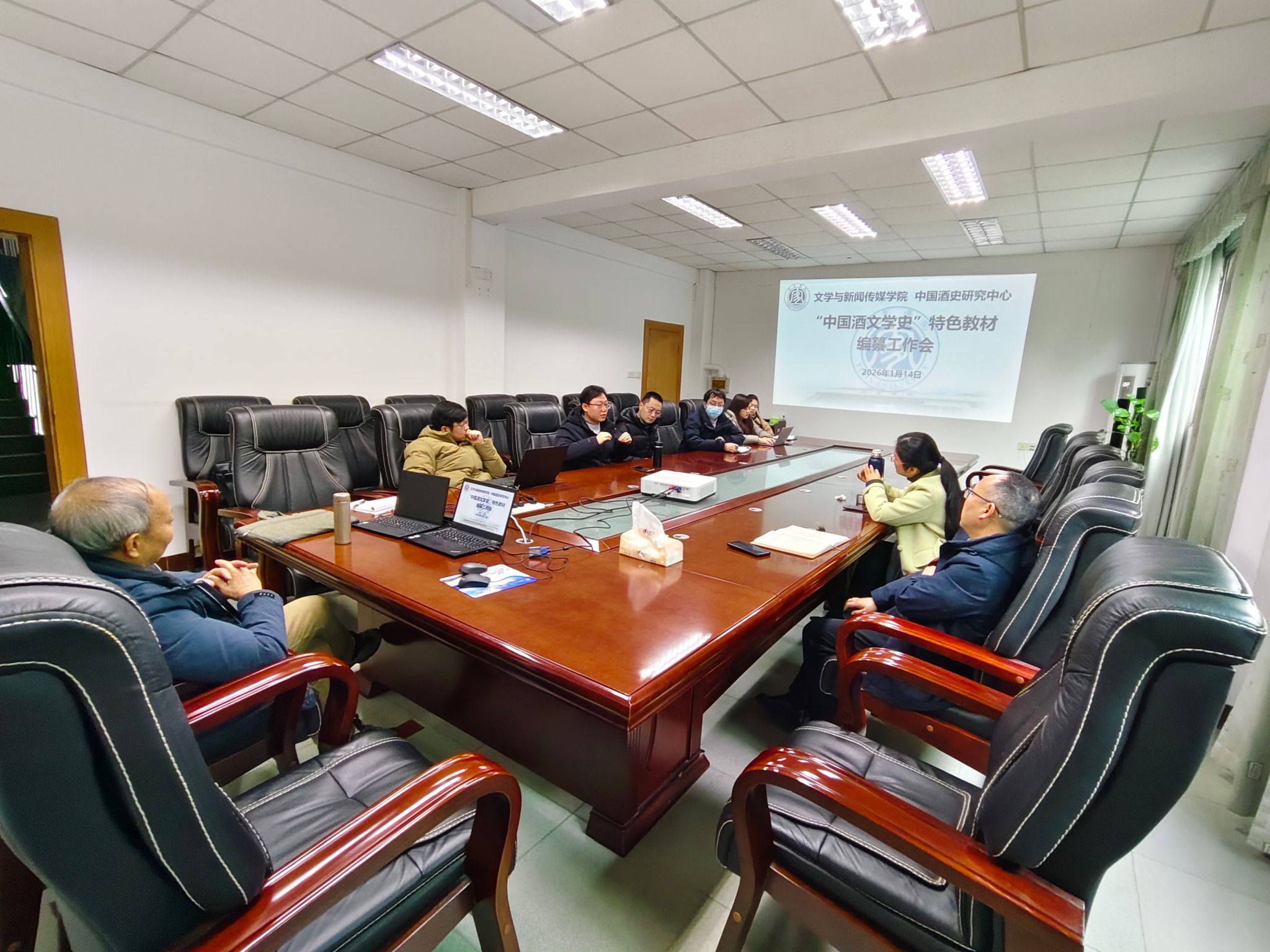 1月14日上午,中国酒史研究中心组织文学与新闻传媒学院古代文学相关教师在学院会议室开展“中国酒文学史特色教材编纂工作推进会。会议由中国酒史研究中心主任高正伟教授主持,特色教材编写负责人、四川省人民政府文史研究馆馆员、中国酒史与酒文化研究专家、中国酒史研究中心首席专家李修余,文学与新闻传媒学院教师沈艾娥副教授、贾陈瑾博士,中国酒史研究中心专兼职研究人员唐炳湟、李东昀、陈昌前、王晋、袁慧、陈利等到场参会。