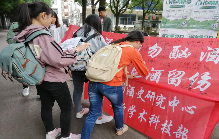 本次活动为系列活动,经协调,首先利用星期日主题班会时间,于5月26日在各班以“健康、文明、理性”展开酒文化主题学习活动。5月29日主要为宣传签名活动,酒史研究中心孟宝老师进行现场宣传,号召同学们积极参与。
