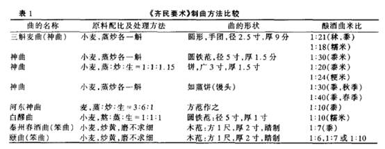 《齐民要术》是酒史研究中最为宝贵的历史资料之一,记载的以小麦为原料的8种曲分为种曲、白醪曲和笨曲。制曲方法的比较见表1。